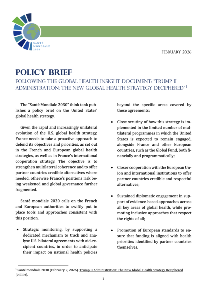 En complément de la note d’éclairage « Administration Trump II : la nouvelle stratégie en santé mondiale décryptée » et face à l’évolution rapide et unilatérale de la stratégie étatsunienne en santé mondiale, Santé mondiale 2030 publie sa note de positionnement à destination des décideurs français et européens.